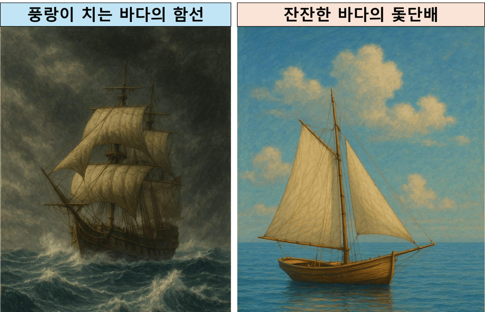 1. 잔잔한 바다의 돛단배 vs 풍랑이 치는 바다의 함선