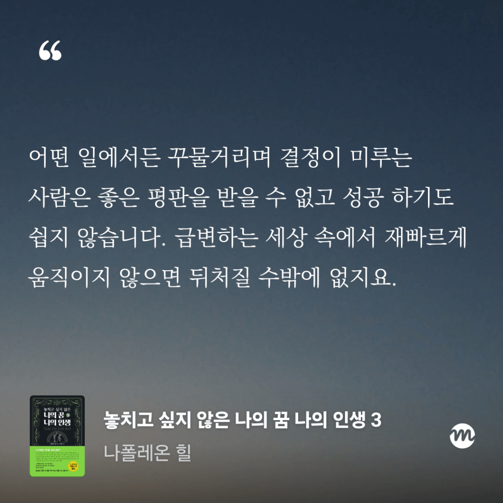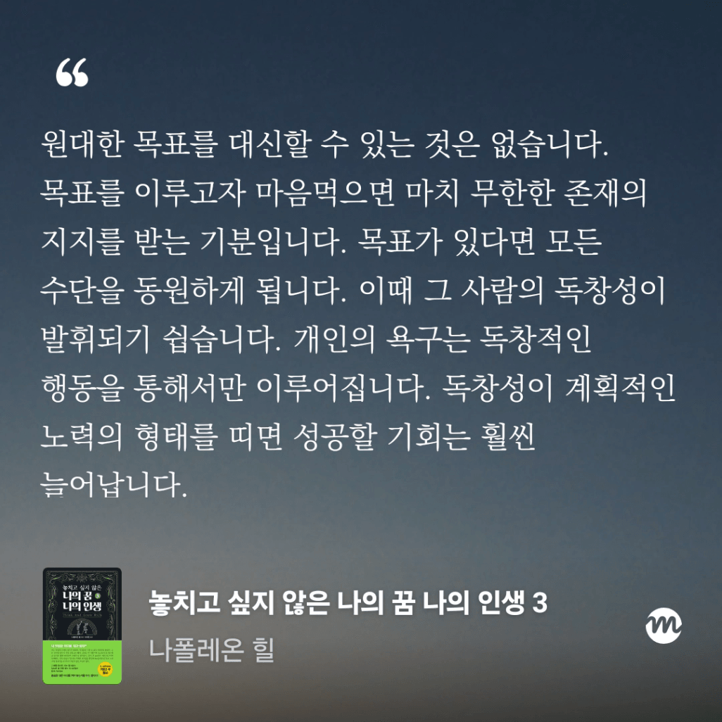 나는 꿈이나 목표보다 생존에 맞춰진 삶을 선택해 왔고, 조금은 편하고 손쉬운 것을 선택하는 것에 익숙해져 있었는데, 이 책은 내가 정말 원하는 것이 무엇인지 묻고, 그걸 위해 달려보라고 제시해주어 좋았다.