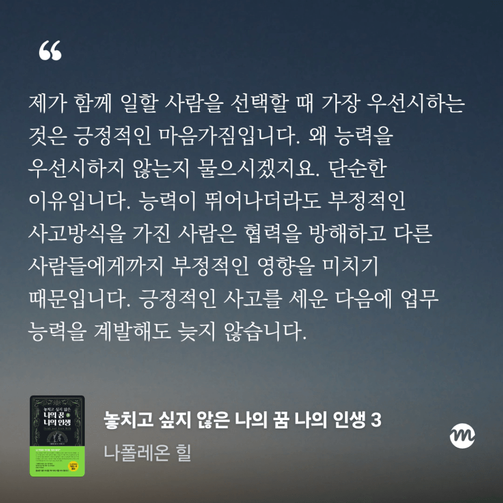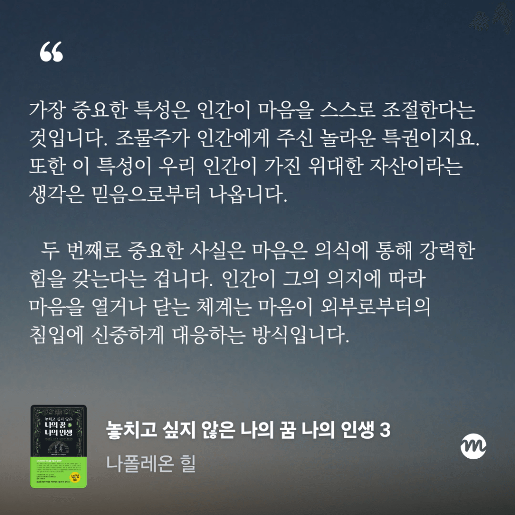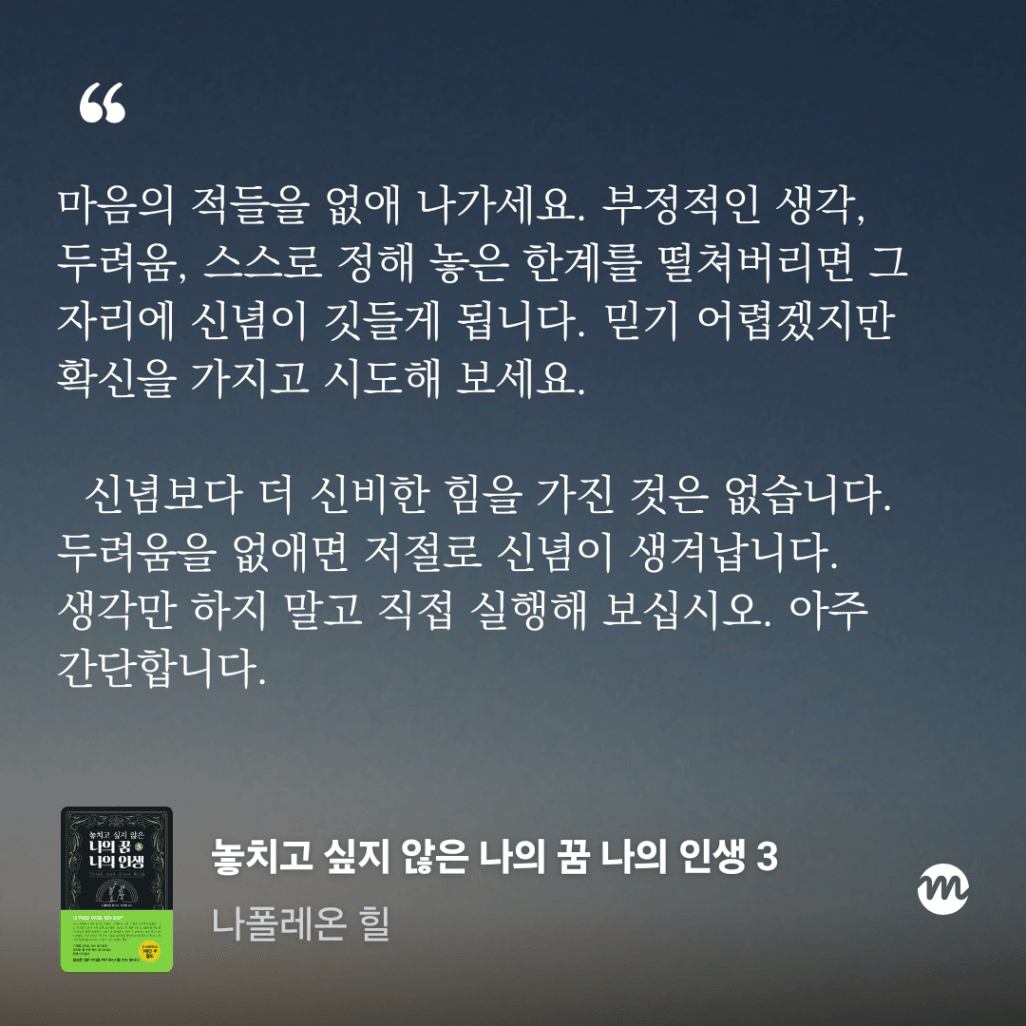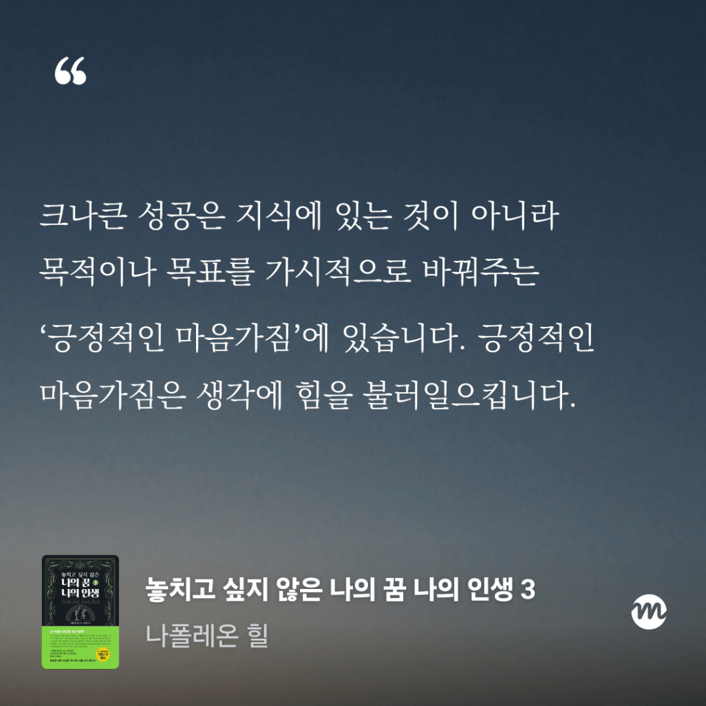 긍정적인 마음을 가지고 성공하라는 내용으로 9단계에 걸친 이야기를 한다.
