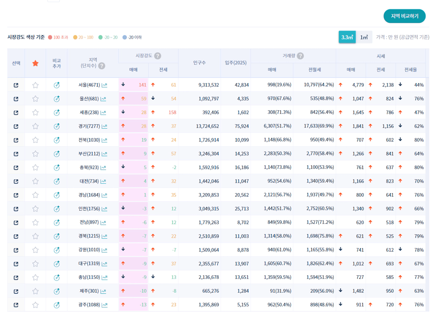 지역별 매매/전세 평당가와 전세가율을 확인할 수 있습니다.