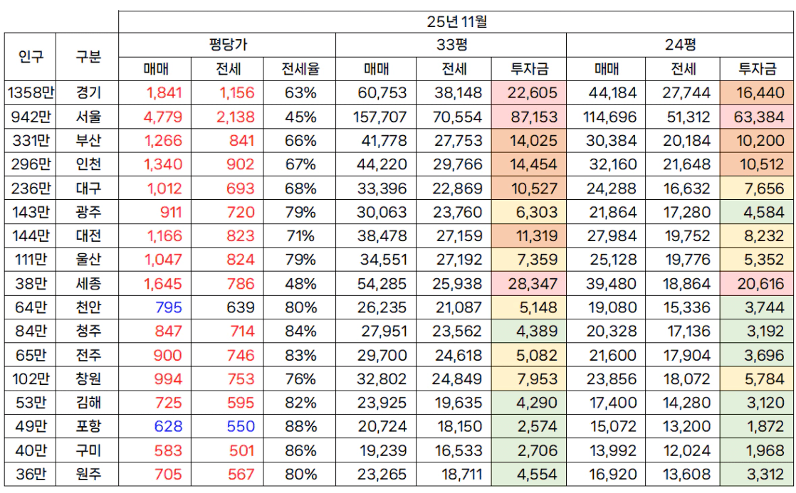 지역별 33평, 24평 평균투자금을 계산해보시면 됩니다.
