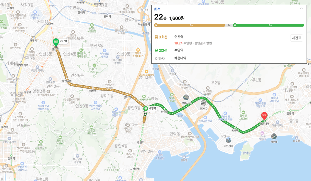 20분대 (환승 1회)로 해운대까지 접근이 가능합니다.