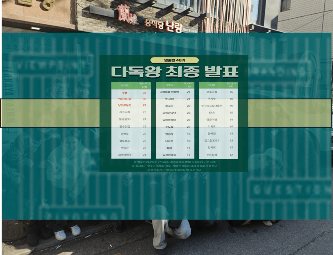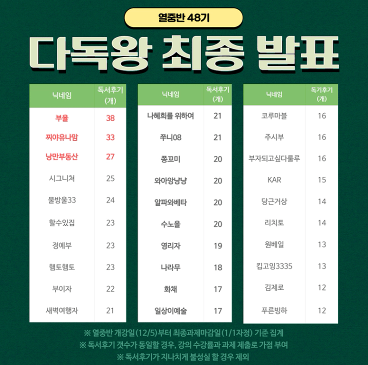 대상:열반 중급반 수강 후 MVP외의 혜택으로, 다독왕 30명을 선발하여 진행