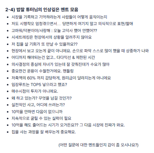 3.임장전 질문에 대해 대답해주시고 임장하면서는 멘토님의 시각에서 어떤걸 보시는지 임장에 입각한 질문들과 답변들로 내가 초보/중수 입장에서 분임/단임시 놓쳤던게 무엇인지