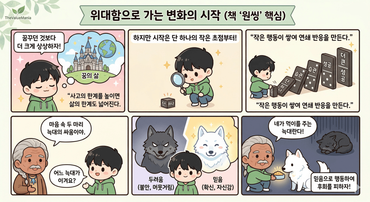 자신이 상상할 수 있는 가장 큰 삶을 꿈꾸고, 그것을 이루기 위해 초점을 가장 작게 맞추어 한 번에 한 걸음씩만 나아가라. 우리 마음속에는 '두려움'과 '믿음'이라는 두 늑대가 싸우고 있으며, 이기는 것은 내가 먹이를 주는(선택하고 집중하는) 늑대다. 인생에서 가장 큰 후회는 '하지 않은 일'에서 온다. 외부에서 답을 찾지 말고, 내 안의 목적의식과 우선순위를 믿고 '첫 번째 도미노'가 되어라.