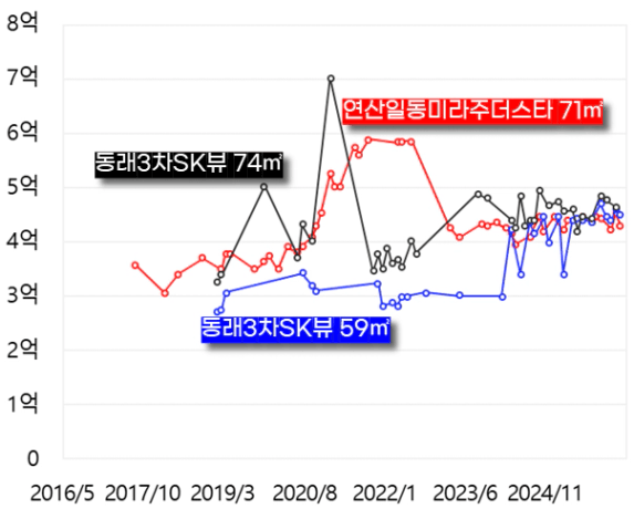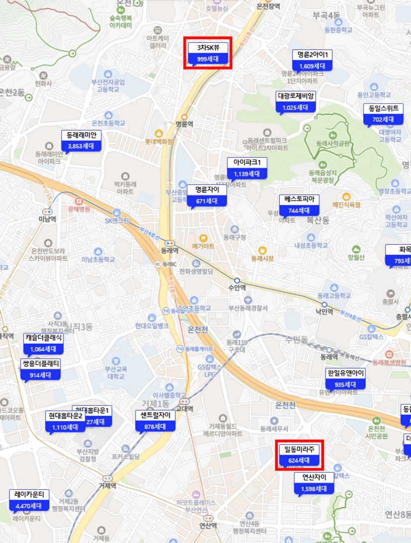 판단 | 동래 sk뷰가 환경 측면에서 조금 더 좋은 것으로 보임 다만, 투자 물건 기준으로 동래3차 SK뷰는 대다수 막힌뷰라고 보면 됨 그럼 매물 대 매물로 비교한다면 동래sk뷰 막힌 뷰 vs 미라주인데 그래도 환경과 연식이 조금 더 좋은 동래sk뷰가 더 가치가 높은걸까?! | ||