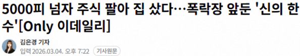 오히려 반면에 일찍 진입하여 시세 차익을 얻은 주주들은 상황이 불안정하니 주식을 정리하고 들어올 수도 있어 보입니다. 예컨대 다주택자 중과 유예 폐지 이후 서울 상급지에서는 시세차익이 큰 보유자 중심으로 매물 증가와 가격 조정 폭 확대가 관찰되었습니다. 이 과정에서 현금 여력이 있는 투자자는 주식 비중을 축소하고 상대적으로 안정적이라고 인식되는 부동산으로 자산을 재배분하려는 움직임이 나타날 가능성도 있습니다.