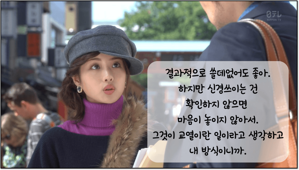 • 생업(job): “오타를 찾고 있습니다.” (생계를 위해, 패션 편집부로 가기 위해 어쩔 수 없이 하는 일)